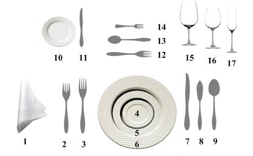 - چیدن انواع قاشق پلوخوری وسوپ خوری و چنگال، معمولا قاشق درسمت راست و چنگال و سمت چپ قرار میگیرد. (در بعضی موارد قاشقها را در وسط بشقاب قرار میدهند.)